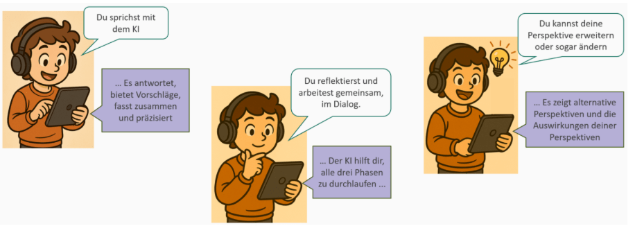 Der AI Perspective Advisor ist für den Einsatz in realen Gesprächen konzipiert. Der Dialog mit der KI wird strukturiert begleitet, visualisiert und am Ende jeder Phase zusammengefasst, um den aktuellen Stand der eigenen Perspektive sichtbar zu machen. Ausgangspunkt ist eine einfache persönliche Aussage, die im Dialog geklärt und schrittweise um weitere Perspektiven erweitert wird. Abbildung 2 zeigt die Funktionsweise und zentralen Funktionen des AI Advisors im Überblick.